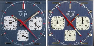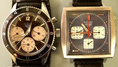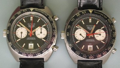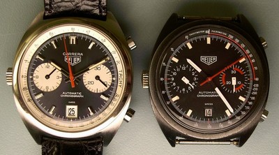 Heuer introduced the autmatic Carreras in 1972, and the Monza in 1977. Although the Carrera and Monza appear to be similar, with the primary difference being the color of the cases, our comparison shows that, in fact, the construction and value of the two models varied considerably. Click the image of these two models or click here to see the comparison.