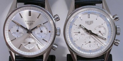 Heuer introduced the Carrera in 1964, and this chronograph has always been hailed as among the most beautiful chronograph designs. The Carrera was produced through the mid-1980's, and was the first chronograph to be re-introduced by TAG-Heuer in 1998, as part of its "Classic" re-edition series . Our comparison of two versions of the Carrera -- the Reference 2447 (from 1964) and the CS 3110 (from 1998) -- covers two of the designs considered to be the purest embodiments of the form. Click the image of the two Carreras or click here to see the comparison of these models.
