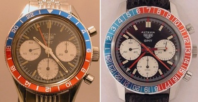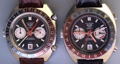 Heuer introduced its first Autavia GMT in 1970, and produced various models of this GMT chronograph throughout the 1970's. Our comparison of two versions of the Autavia GMT -- the 1163 GMT (introduced in 1970) and the 11630 GMT (introduced in 1972) -- shows that these versions were different in almost every respect (dials, hands, movements, bezels, cases, etc.). Click the image of the two Autavias or click here to see the comparison of these models.