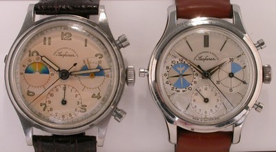 Heuer began producing the Seafarer for Abercrombie & Fitch in the early 1950's and continued producing this model through the early 1970's. By that time, Heuer was also offering its own Mareographe and producing the Solunagraph for Orvis. Our comparison of the Abercrombie & Fitch Seafarers covers nine different versions, that utilized five different cases, and a colorful array of dials and hands. Click the photograph of the two Seafarers or click here to see the comparison of these models.