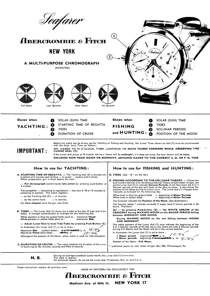 The following table is a summary of the production changes in Abercrombie & Fitch Seafarer chronographs, from the introduction of this model in the early 1950's through the last model, produced over 20 years later. This table highlights the changes made in the Seafarers, on a feature-by-feature basis, in order to provide a history of this chronograph.