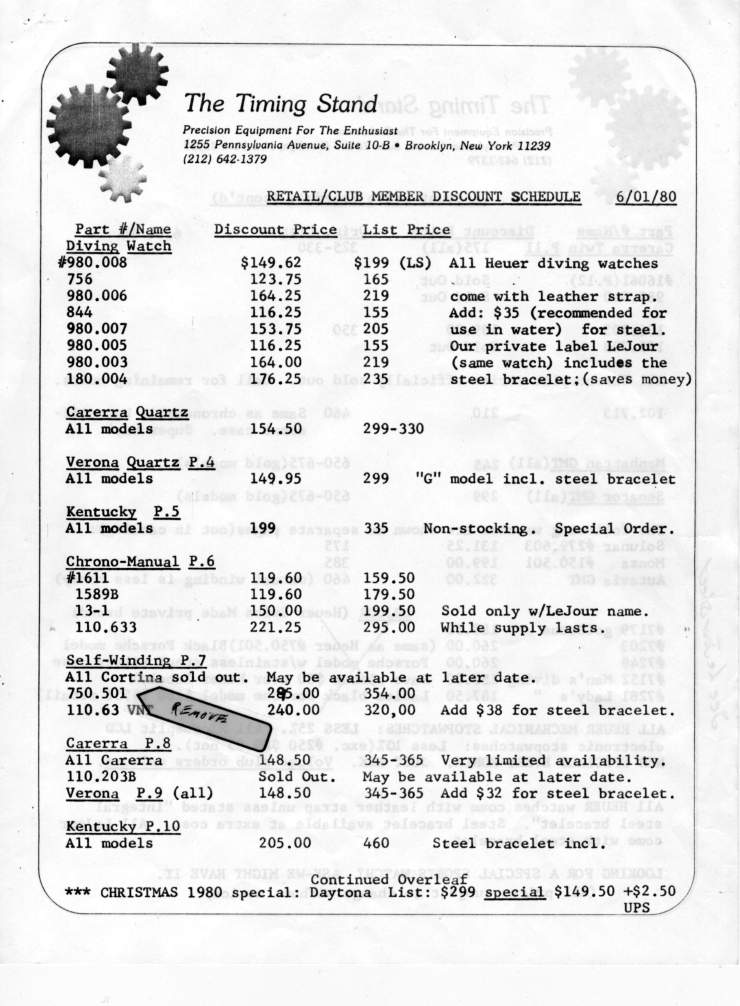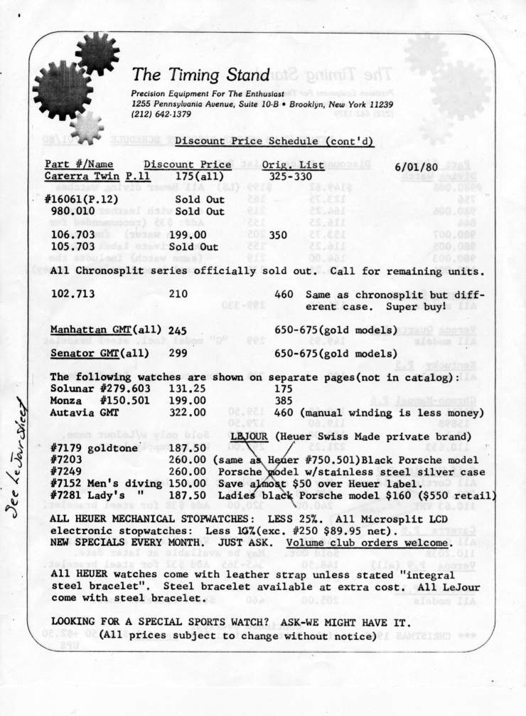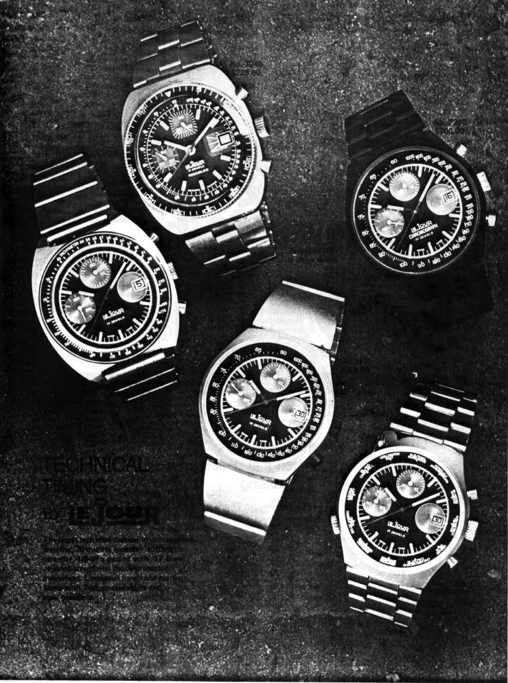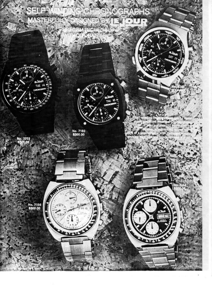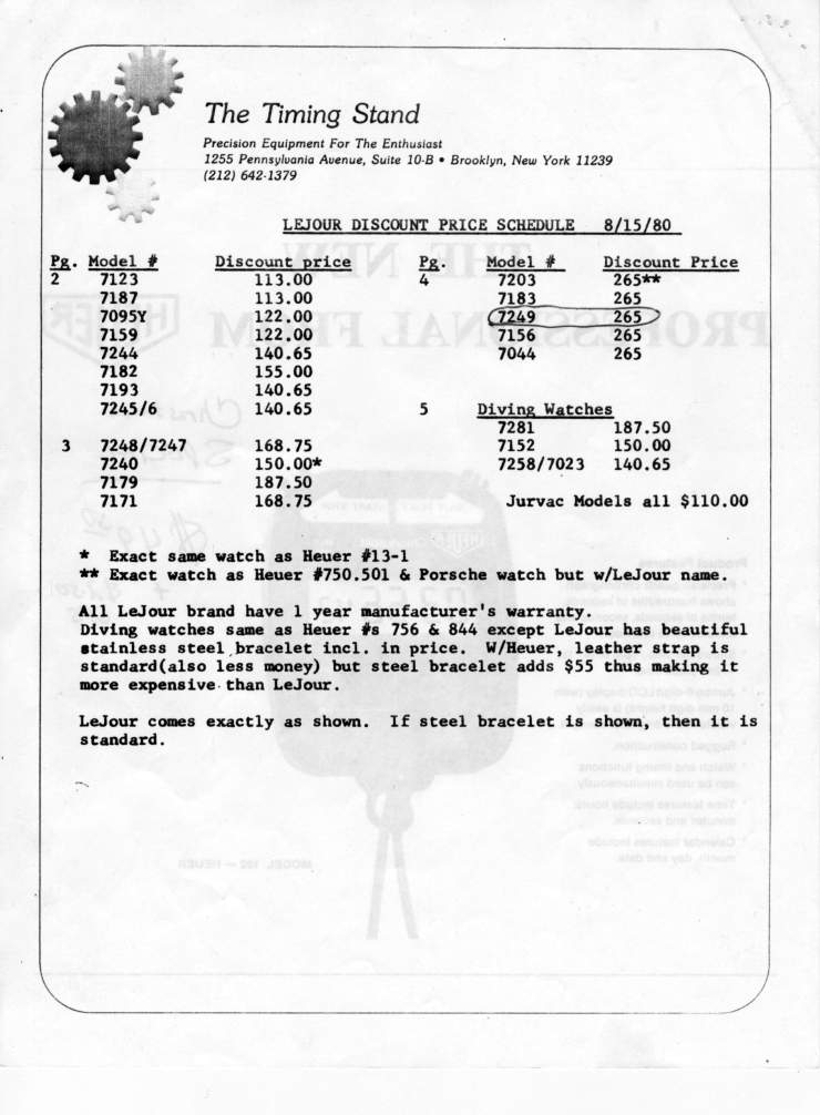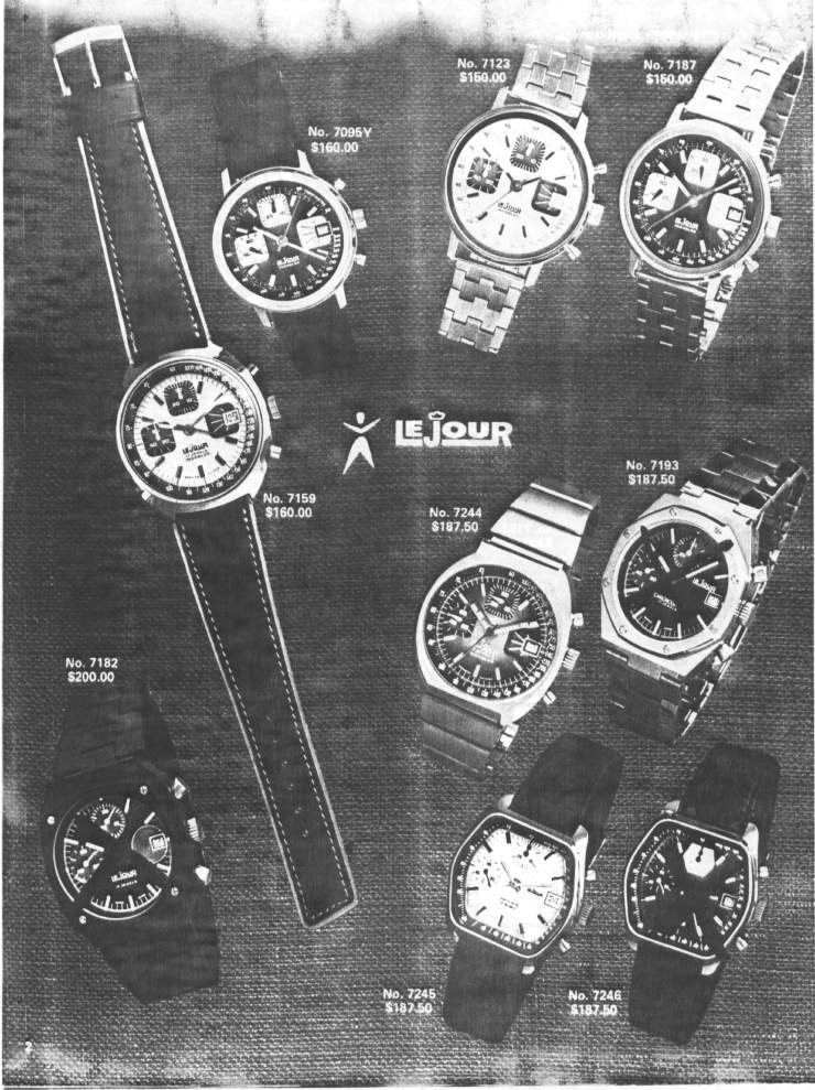 Heuer manufactured LeJour chronographs under a private-label arrangement. The following dealer catalog, dated June 1980, offers the line of LeJours as an alternative to the Heuers. For example, the LeJour model 7203 is offered as the "exact same" watch as the Reference 750.501 (Pasadena), except that the Lejour sells for $265, against a list price of $300, while this dealer offers the Heuer Pasadena for $295, compared with a list price of $354.