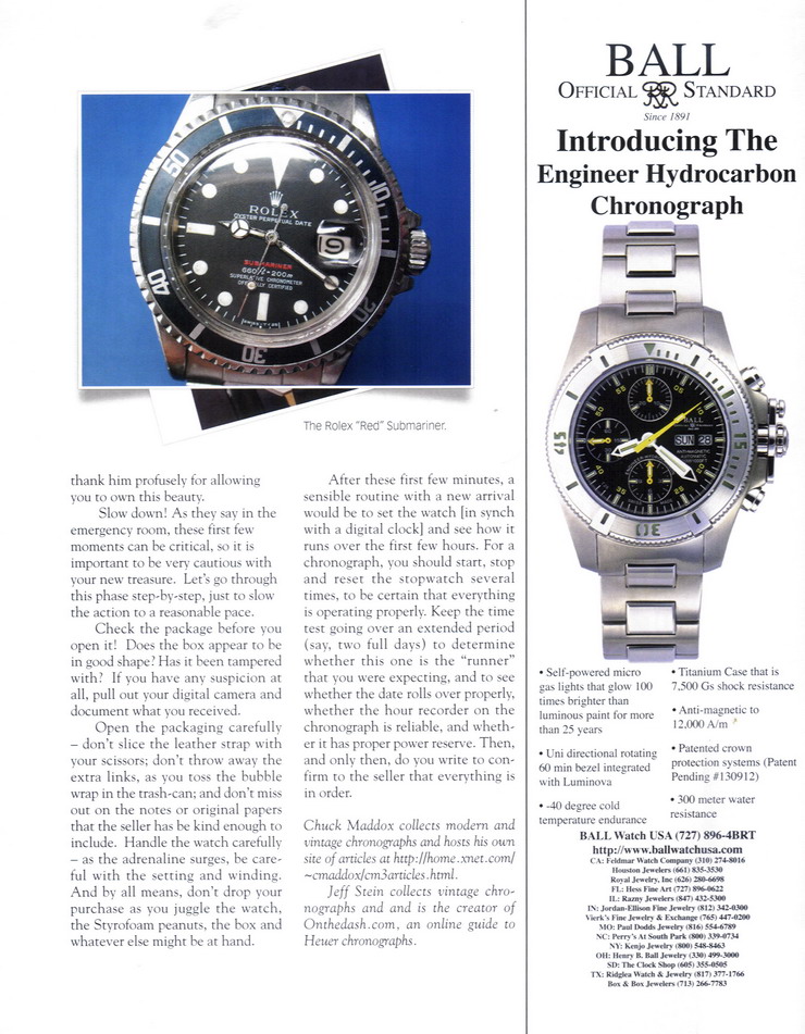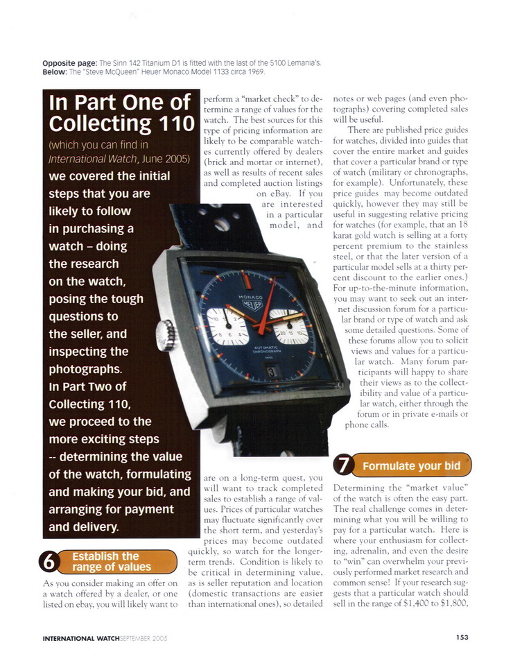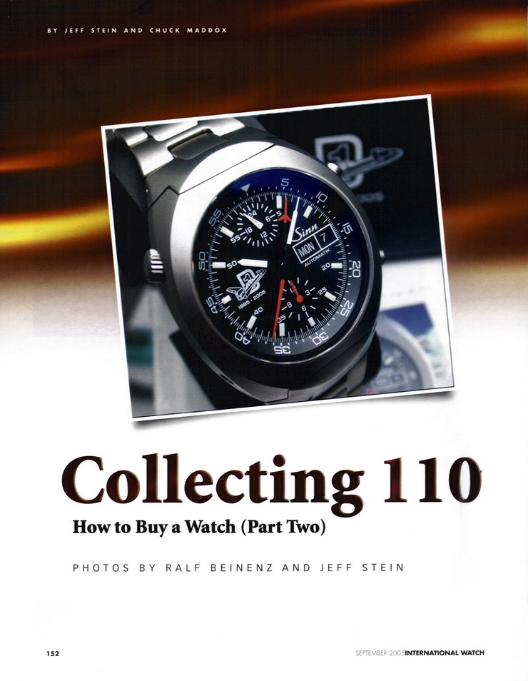 Collecting 110 -- How to Buy a Watch (Part Two) by Chuck Maddox and Jeff Stein International Watch, September 2005 Cover of September 2005 Issue of International Watch Article 1st Page / Page 152 Article 2nd page / Page 153: Article 3rd page / Page 154: Article 4th page / Page 156: Article 5th page / Page 158:
